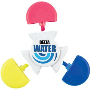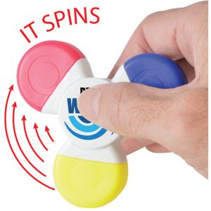 Be the envy of the office or classroom with this cool spinner tri colour highlight marker. White body with 3 chisel tip highlight markers. Yellow, Pink, Blue with matching coloured click in caps. Steel bearings for fast spinning action. Centre is printed with your logo on one side of the highlight marker. Decoration is by pad printing or CMYK full colour printing. Minimum order: 100 Lead time: 2 weeks