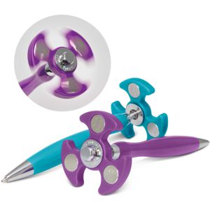 Attract the attention of your clients with this fantastic novelty pen that writes but also has that additional novelty appeal! Retractable plastic and metal ball pen which features a stress relieving fidget spinner on the top. Simply give it a spin and the momentum produced provides a therapeutic sensory experience. It can be spun while holding or writing with the pen and it will spin like a top upside down on a hard surface. Spinner Pen really attracts attention and offers an exciting opportunity to put a logo or message in the hands of a huge potential audience. It has a black refill with 600 metres of German manufactured Dokumental ink. Perfect for schools, Universities, trade shows or just general promotional giveaways! Fiddle Spinner Pen is patented under USA registered patent 9,950,556, Australian patent application no. 2018202349, New Zealand patent application no. 741287, Australian design no. 201716080, New Zealand registered design no. 423567. Due to small parts this item is not intended for use by children under the age of 3 years. Decoration is by pad printing. Minimum order: 100 Lead time: 2 - 3 weeks