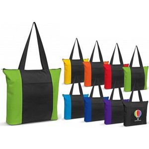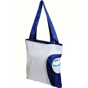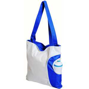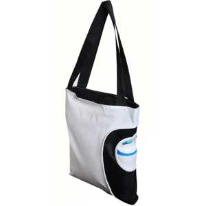 Tote bag manufactured from 600D polyester. Features a side slip pocket, zippered main compartment. Double shoulder straps. Decoration is by a screen print or full colour digital transfer. Minimum order: 50  Lead time: 2 - 3 weeks