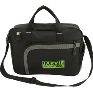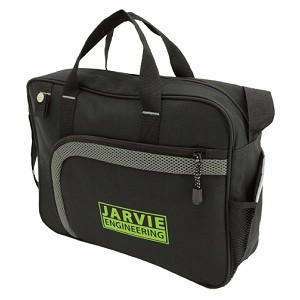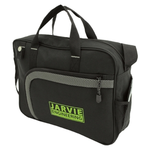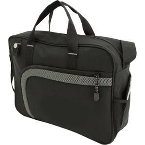 Made from 600 denier nylon and comfort mesh. Features a large main zippered compartment with padded laptop holder. Front zippered pocket with two inside small open holders. One elastic mesh pocket on the right, a small loop with button closure, a business card holder at the back. Shoulder strap and carry handle. Custom factory orders only: 12 week lead time