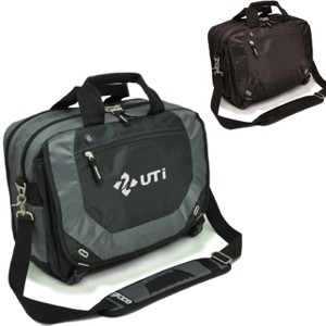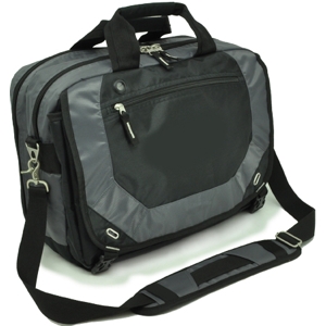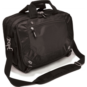 Large main zippered compartment with 3 inside open pockets. Second main zippered compartment with file divide. Padded laptop pocket with organizer under the front flap with double buckle closure. Front zippered pocket with internal mesh pocket and hidden hole for earphone. Elasticised neoprene pocket at the right. Zip open end pocket at back to fit over trolley handle and small open pocket. Adjustable shoulder strap with extra large pad and carry handle. Textured nylon. Custom factory orders only:  1 2 week lead time