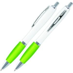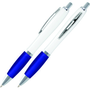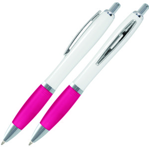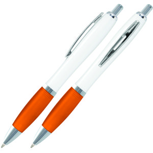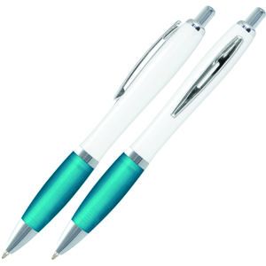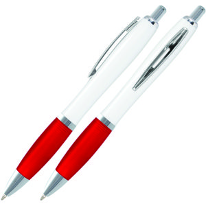 Retractable plastic and metal ball pen with a soft touch rubber lacquered grip. Has a black ink large volume refill with 1800 metres of German manufactured DOKUMENTAL ink and a tungsten carbide ball for improved writing quality. Blue ink available for an extra charge. Silver barrel and colour barrel Vista pens also available. Decoration is by pad printing or CMYK digital direct printing. Minimum order 250. Decorated orders: 2 week lead time